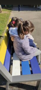 Ce très beau banc, très coloré, bien visible et reconnu par tous, permet aux enfants qui se sentent tristes ou seuls de s’y installer tranquillement pour se ressourcer, se reposer.